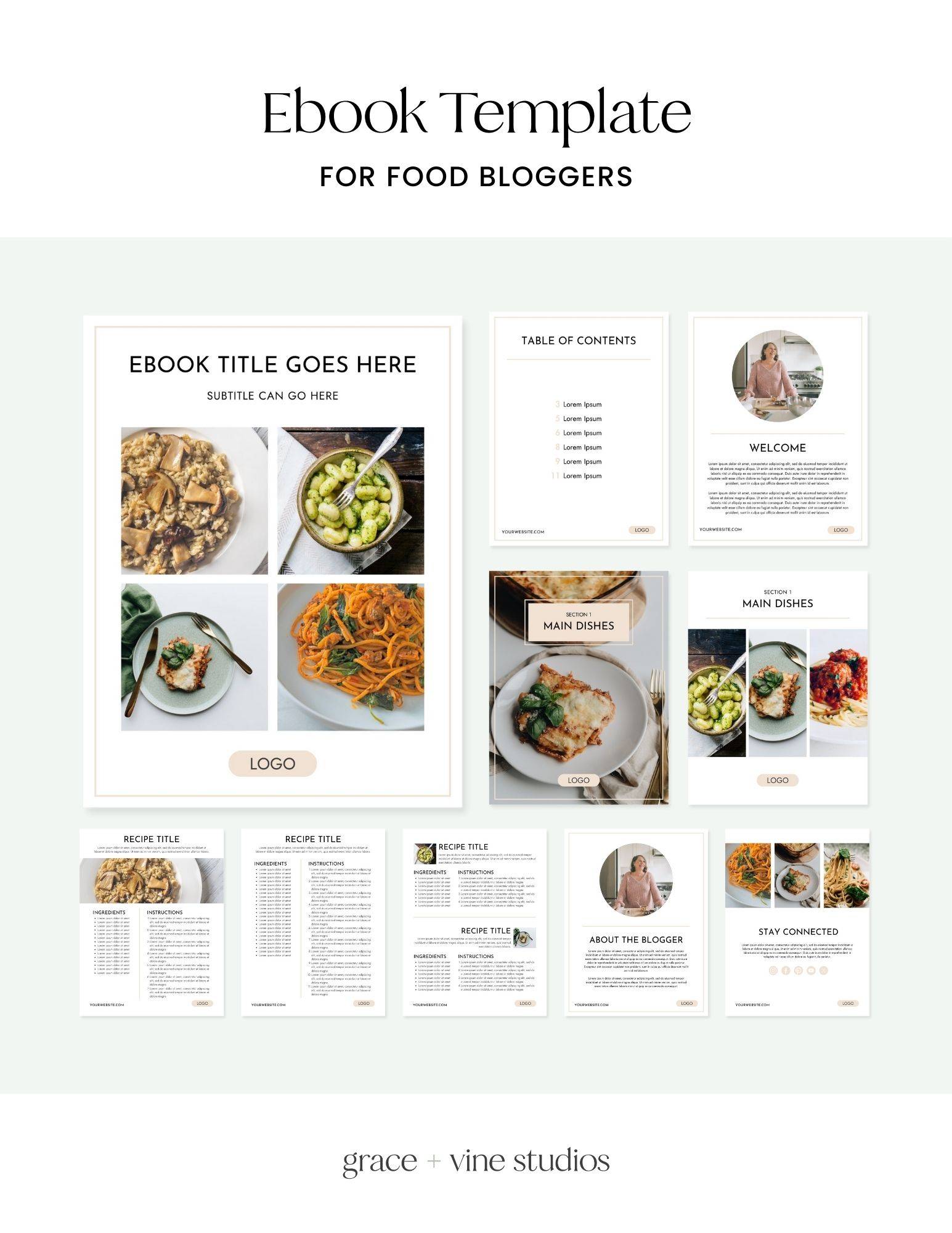- Complete 10-page Canva template set with cover, table of contents page, intro/welcome page, 3 recipe pages, 2 section title pages, about the author page and final page with call-to-action and social links